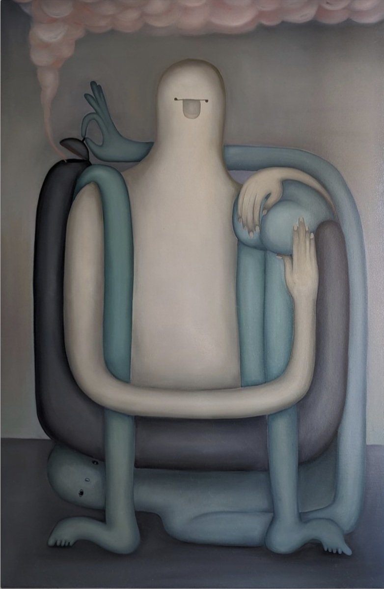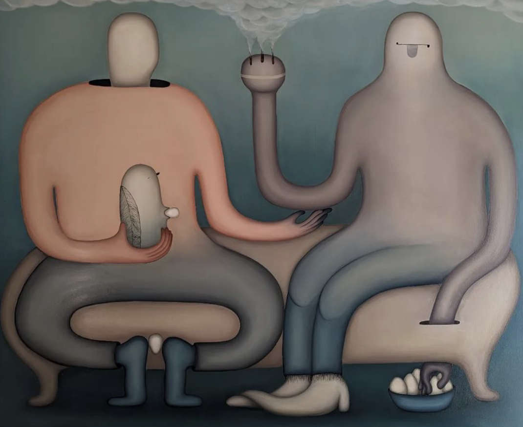 Mutto Matto's paintings evoke feelings of strangeness and intrigue, humor and anxiety, prompting viewers to contemplate their meaning and symbolism. Smooth lines and gentle color transitions create a sense of continuity and unity. The artist explores the theme of simple forms and consciousness, blending human features with abstract elements, and transitioning from abstraction to figuration with elements of surrealism. In her works, MuttoMatto seeks to convey the complexity of the human experience.